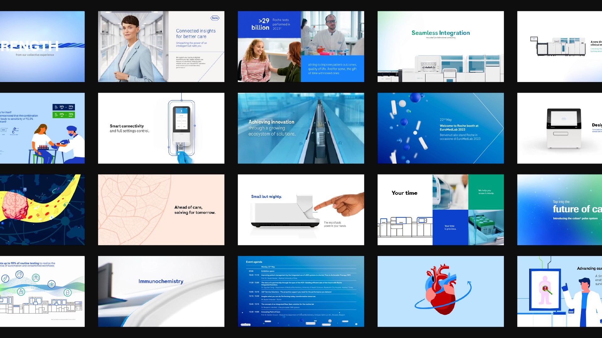 This project covered the full content lifecycle for four major events for the company Roche Diagnostics in Munich (2022), Korea (2022), Rome (2023), and Brussels (2025), delivering more than 40 hours of running content across all event screens. As a Graphic Designer and part of the core team at OH37, the agency where I have been working for the past four years, I developed the visual narratives and overarching graphic assets for each location, while assisting in the technical execution of content—including pixel maps and video assets—and contributing on-site photography, and videography direction to ensure a cohesive experience.